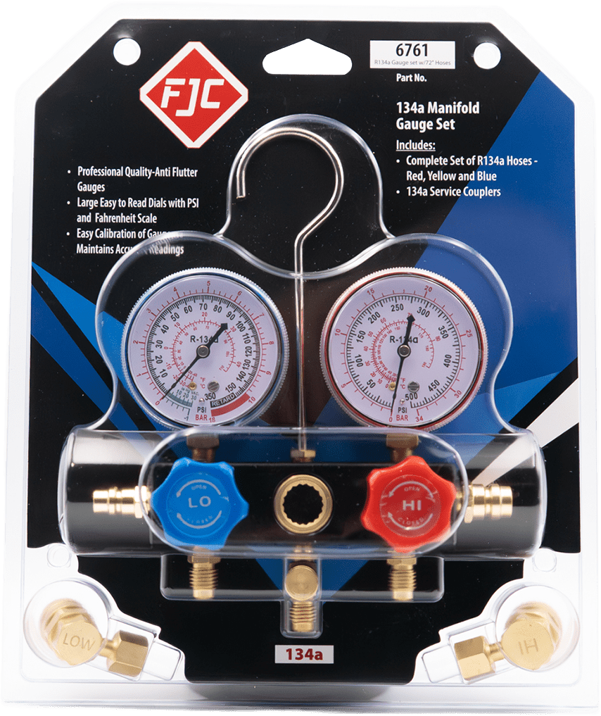 - FJC’s A/C Manifold Gauge Sets test automotive air conditioning systems by comparing the pressure readings between the “high side” and “low side” to manufacturers’ specifications.